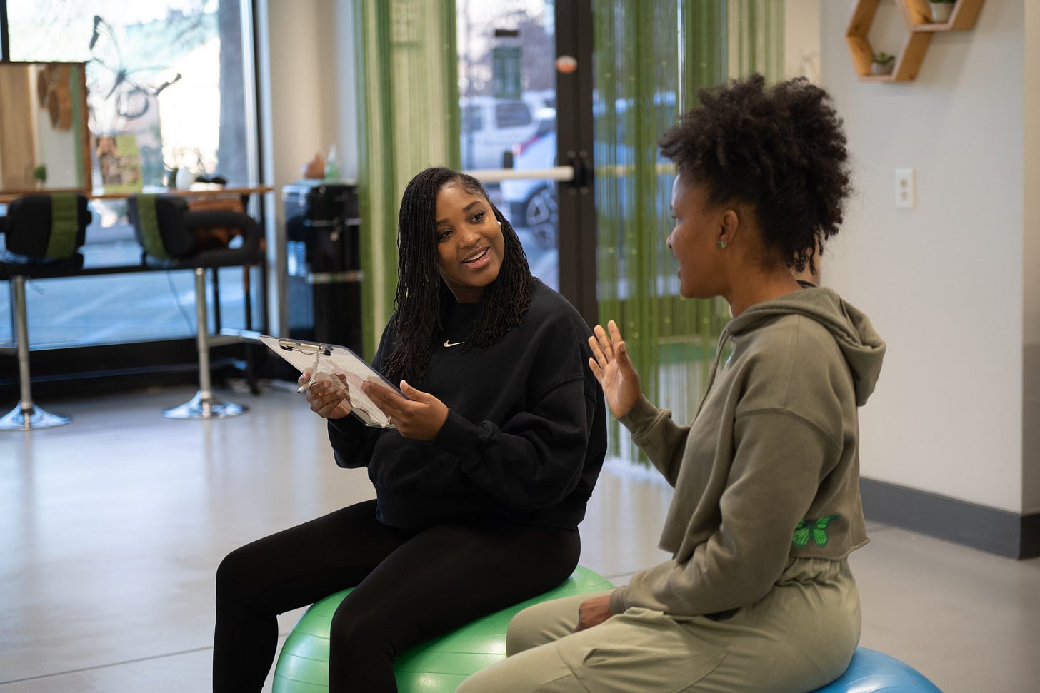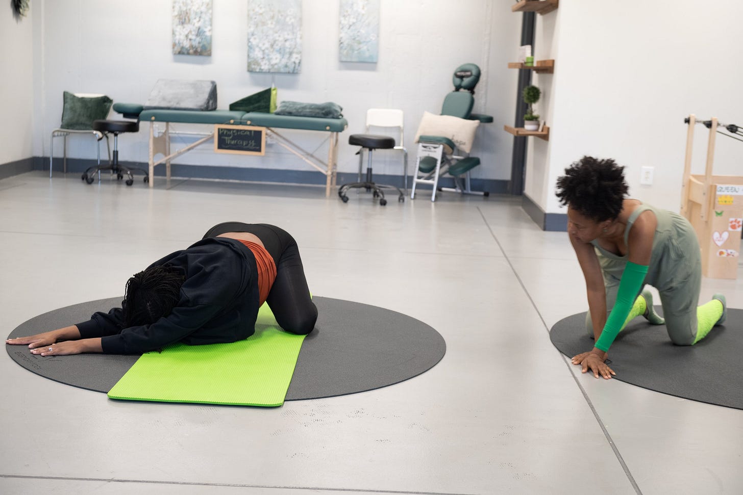 The shoot took place in her serene studio, bathed in soft natural light. The space—with its calming hues and welcoming energy—set the perfect tone for the session. I focused on capturing her in action, guiding her clients through breathing exercises and mindful movements that embody the strength and grace of motherhood.